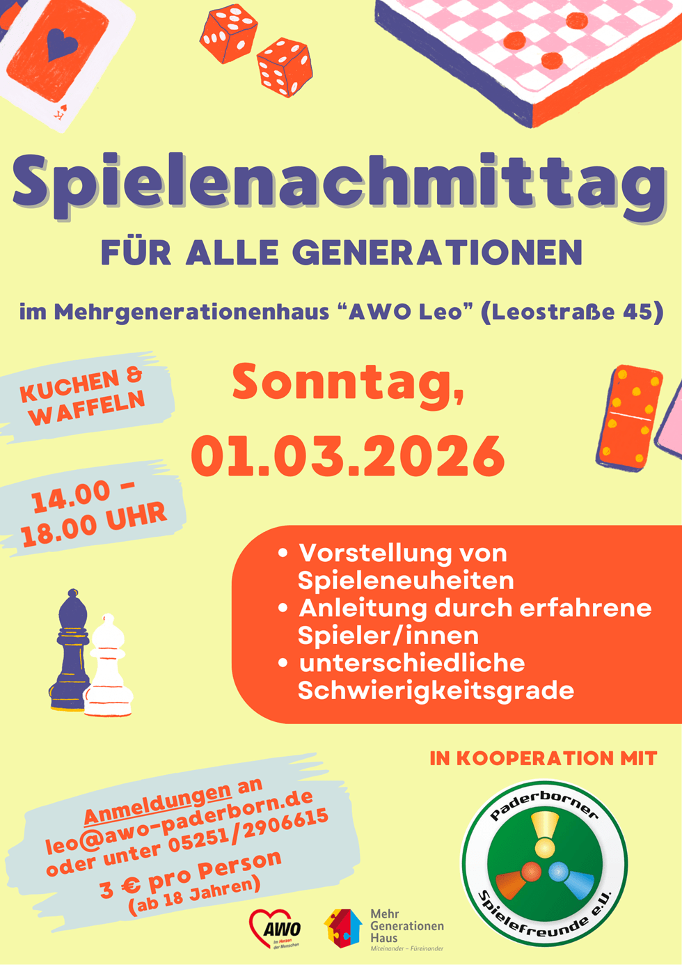 WICHTIG: Solltet ihr beabsichtigen, den Spielenachmittag zu besuchen, kündigt das bitte per Mail an leo@awo-paderborn.de an. Die vorher erreichte Anmeldezahl entscheidet darüber, ob die AWO den Spielenachmittag tatsächlich stattfinden lässt oder wegen zu weniger Anmeldungen absagt.